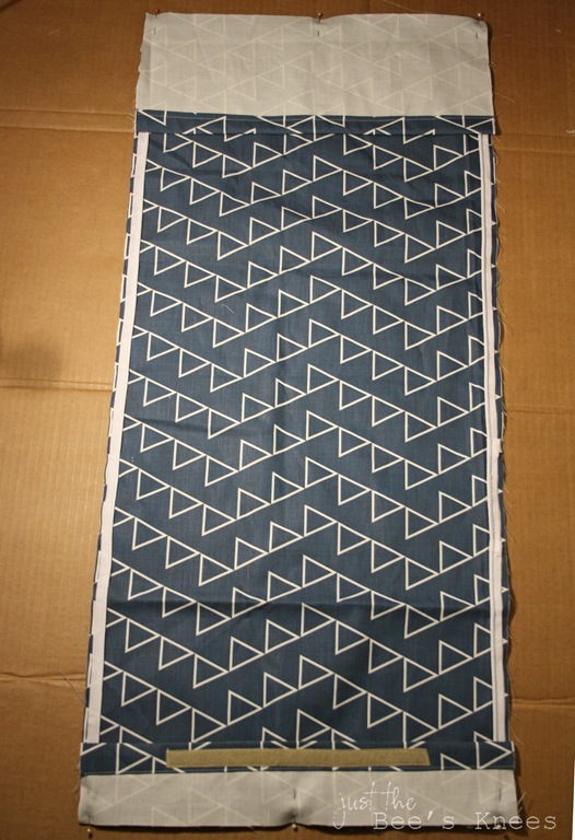 Once they are pressed, stitch along the edge to secure. On the top of the bottom pocket, stitch on a piece of the Velcro the same size as the existing Velcro on the seat frame. (Just make sure you use the opposite of what is already on the chair so the Velcro will hold together! For ex. if the chair has the loop side, sew on the hook side to the fabric)