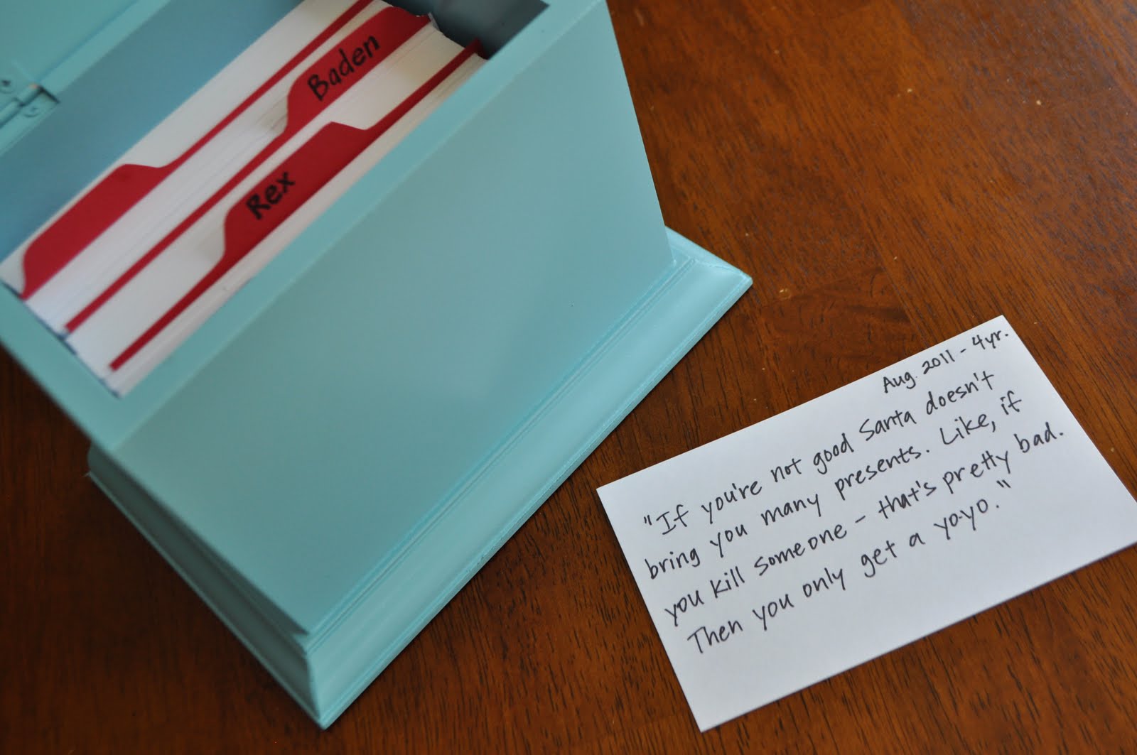 The Memory Quote Box is a dressed up recipe box filled with index cards, and each kid has a tabbed section, so every time they say something that makes you laugh out loud, just jot it down, file and voila! A box full of memories.