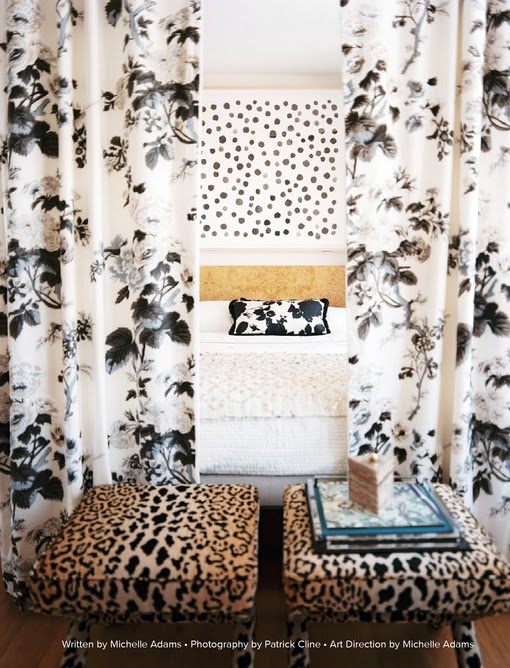 An easy way is to use accent pillows. The spots paired up with beautiful Schumacher Chiang Mai Dragon fabric or another floral pattern make a great combo. Ground it with a bold geometric rug and your done!